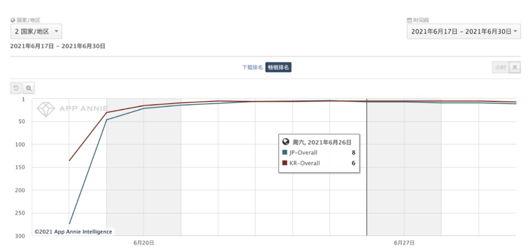 新游方面,腾讯 6 月中旬上线的战棋 RPG 手游 Alchemy Stars 在日韩体现微弱,上线首周即杀入日韩热销榜前十。下图为 Alchemy Stars GP版别在日韩的排名状况。