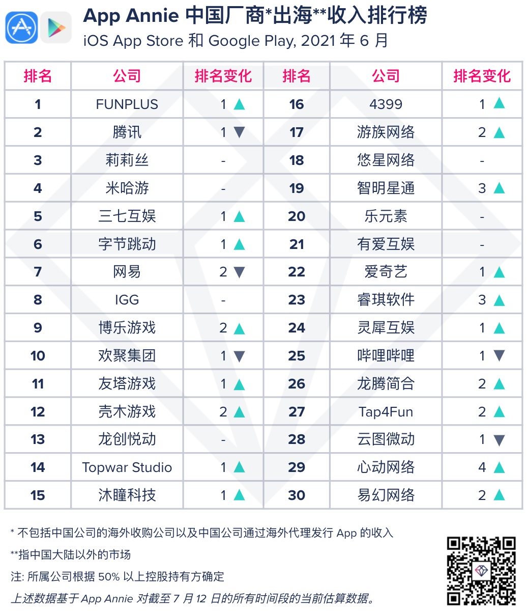 2021 年 6 月我国厂商及使用出海收入 30 强榜单