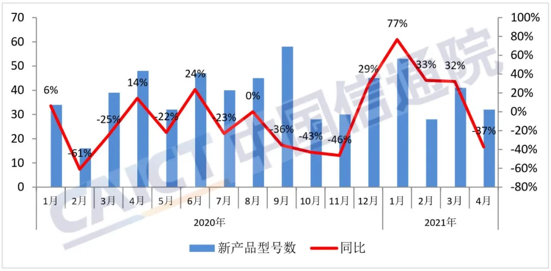 2021年4月,国内手机上市新机型32款,同比下降37.3%。1-4月,上市新机型累计154款,同比增加15.8%。
