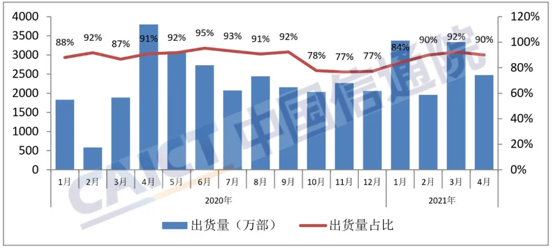 2021年4月,国内商场5G手机出货量2142.0万部,占同期手机出货量的77.9%;上市新机型16款,占同期手机上市新机型数量的50.0%。1-4月,国内商场5G手机出货量9126.7万部、上市新机型80款,占比分别为72.7%和51.9%。