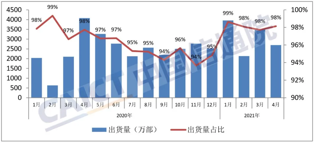 2021年4月,智能手机出货量2697.3万部,同比下降33.9%,占同期手机出货量的98.1%。1-4月,智能手机出货量1.23亿部,同比增加39.1%,占同期手机出货量的98.2%。