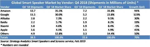 Strategy Analytics董事大卫•沃特金斯( David Watkins )评论道:“智能扬声器和智能显现器在曩昔的假日再次成为最受欢迎的科技产品,咱们估量,全球现在有6000多万户家庭至少具有一款设备。”事实证明,谷歌的Home Hub、亚马逊的Echo Show以及百度的小度在家等智能产品遭到顾客的欢迎,智能显现器在2018年第四季度的出货量占总需求的10%以上,估计到2019年将成为商场增加的重要推动力。